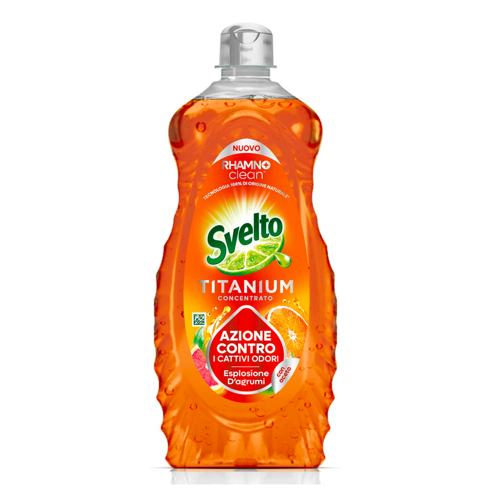 Svelto Titanium Anti Odore Esplosione di Agrumi Concentrato 650 ml è il detersivo piatti studiato per eliminare efficacemente grasso e cattivi odori, lasciando stoviglie perfettamente pulite e fresche. La formula concentrata agisce anche sullo sporco più ostinato, mentre la profumazione agrumata intensa neutralizza gli odori persistenti di cibo e pesce.